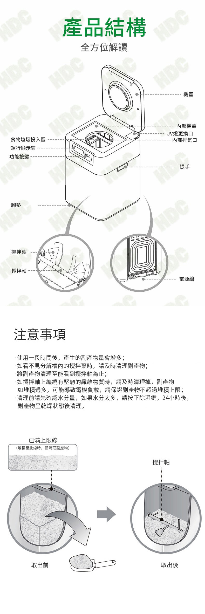 產生的有機肥因為有機質含量較高,需暫停放新的廚餘,完成整個分解程序後 方可使用